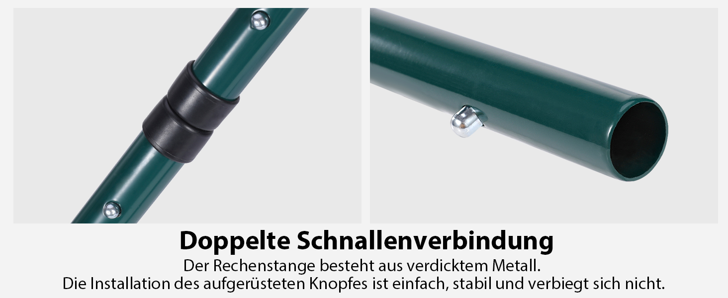 Die Montage unseres Rasenrechen ist denkbar einfach: Ziehen Sie die Schrauben fest, um die Platte sicher an der Stange zu befestigen, und drücken Sie den Knopf, um den Griff zu montieren. Die Möglichkeit, den Winkel der Stange individuell anzupassen, sorgt dafür, dass Sie bequem arbeiten können, unabhängig von Ihrer Körpergröße.