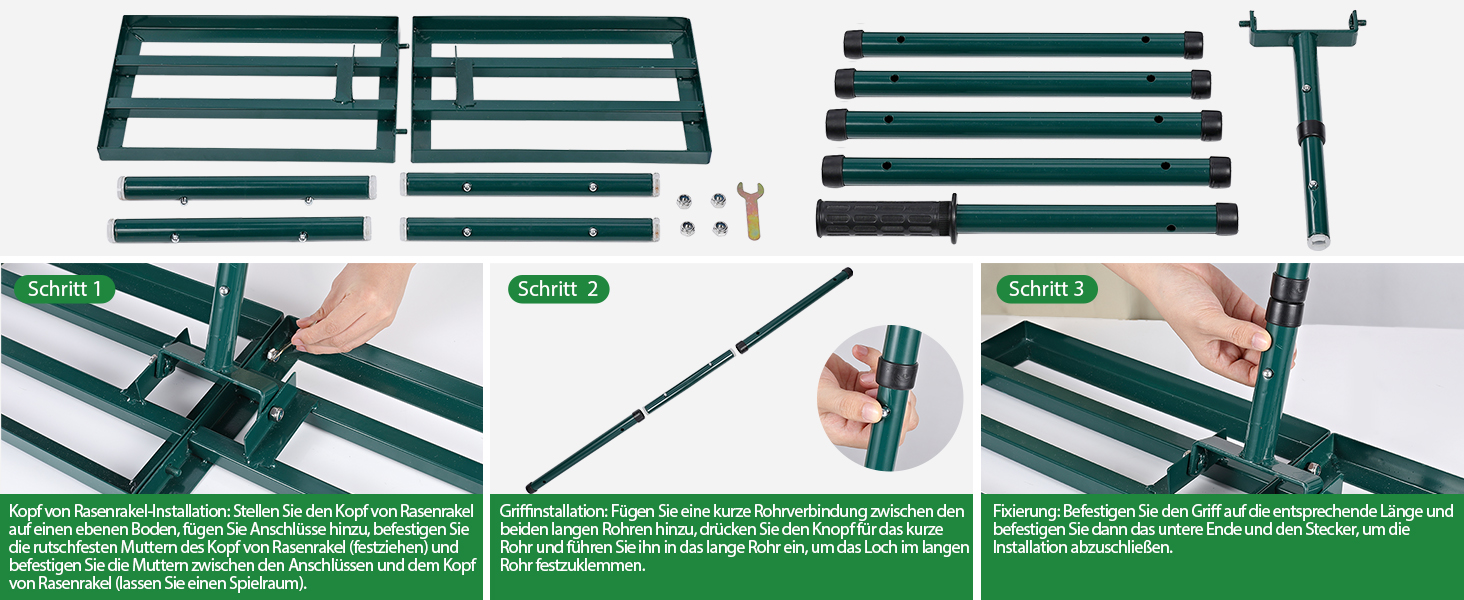 Mit dem im Lieferumfang enthaltenen Originalgriff sparen Sie Zeit bei der Suche nach dem passenden Zubehör. Das durchdachte Design ermöglicht es Ihnen, das Rasenglättungswerkzeug innerhalb von nur einer Minute zusammenzubauen und sofort zu nutzen. Passen Sie die Länge des Griffs flexibel an Ihre Bedürfnisse an, um eine komfortable Handhabung zu gewährleisten.