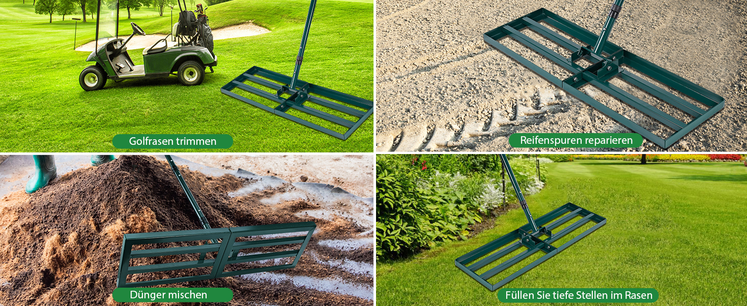 Dieser Rasenrechen ist nicht nur für den heimischen Garten geeignet, sondern findet auch Anwendung auf Golfplätzen, Rasenflächen, in Höfen, Bauernhöfen, Fußballfeldern und Weiden. Er ist perfekt zum Einebnen von Erde, Sand, Mutterboden und Kompost, was ihn zu einem unverzichtbaren Werkzeug für alle Gartenliebhaber macht.