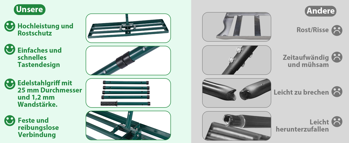 Unser Rasenrechen besteht aus solidem Edelstahl, der ihn nicht nur stark und widerstandsfähig macht, sondern auch vor Verbogen oder Rost schützt. Auch bei feuchten Bedingungen auf nassen Rasenflächen zeigt unser Produkt Höchstleistungen, was ihm eine lange Lebensdauer verleiht.