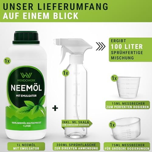 Im Lieferumfang enthalten ist ein praktisches 300 ml Sprühflasche sowie ein 15 ml Messbecher, mit dem Sie das Neemöl im perfekten Mischverhältnis von 1:100 dosieren können. Dieses Komplettset ermöglicht es Ihnen, die Anwendung auf Ihre Pflanzen unkompliziert und präzise abzustimmen.